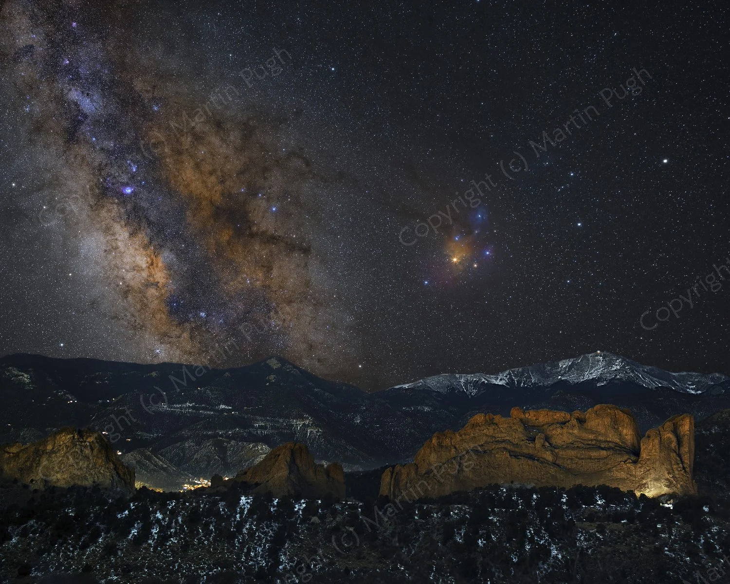 The Mesa Overlook just outside the Garden of the Gods offers a splendid view of the Garden and Pikes Peak, otherwise known as America’s Mountain. Consequently, I chose this spot to stage this photograph, taking the landscape image in Winter utilising natural moonlight to illuminate the snow, the mountain and the foreground. However, the Milky Way image was taken in Summer, from 80 miles away, but utilising a reference image taken from the same spot to scale and position the MW over the Peak. The result is a serene and spirited composite image of one of the most beautiful locations in Colorado, punctuated by the colourful and majestic Milky Way.